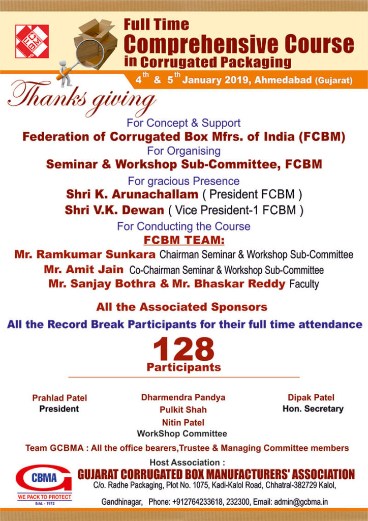 Comprehensive Course in Corrugated Packaging 4th & 5th January 2019, Ahmedabad (Gujarat)